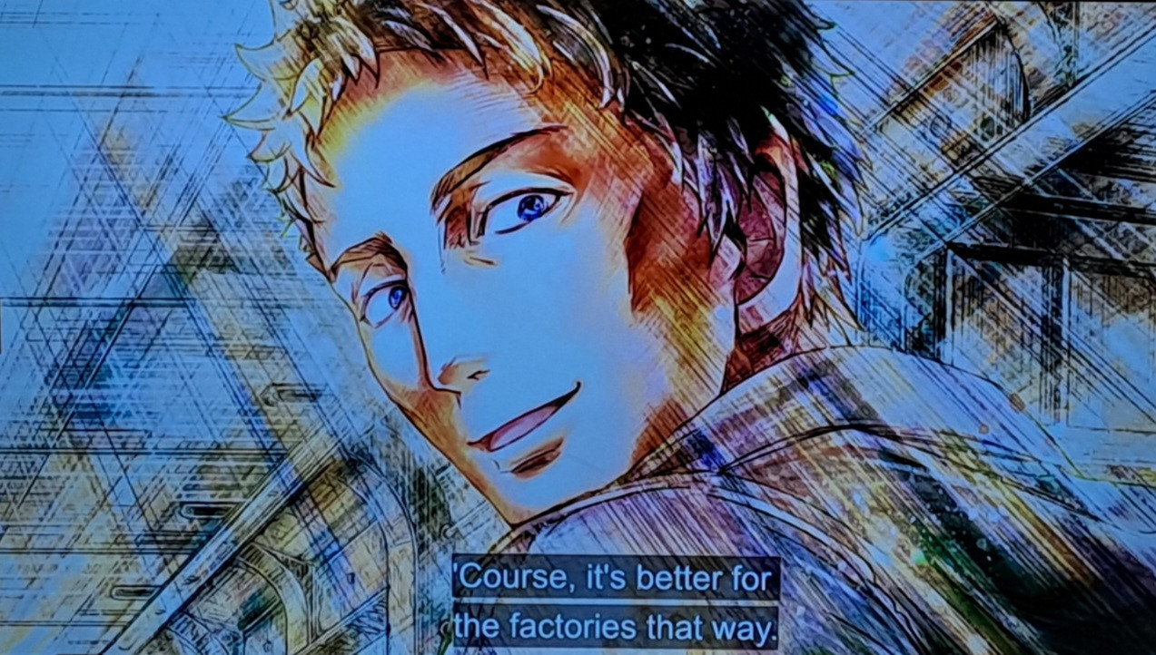 Die Segregation (in der Stadt sowie die Städte unter sich in a bigger picture), die Ausbeutung und der düstere Ton macht sehr viel Sinn bei geringen und schwer erhältlichen Ressourcen und spiegelt sich nicht nur im Plot wieder, sondern auch in der Bitterkeit der Charaktere und deren Motive (Zwangsheirat, Menschenhandel, Korruption, Gier, Kind wird alleine in den [was man meint] sicheren Tod geschickt). Die beiden Hauptcharaktere 煌四と 灯子 sind essentiell nichts besonders, mehr spezielle Produkte ihrer Umstände, wobei 灯子 mehr als 煌四。Dabei ist der Intellekt von 煌四 sein Hebel, im Gegensatz zu 灯子, die ihre Umgebung beeinflusst mit ihrer kindlichen Naivität, ihrem grossen Herz und ihrem unmatched Mut zusammen mit Tanaka (credits where credits due 😉).