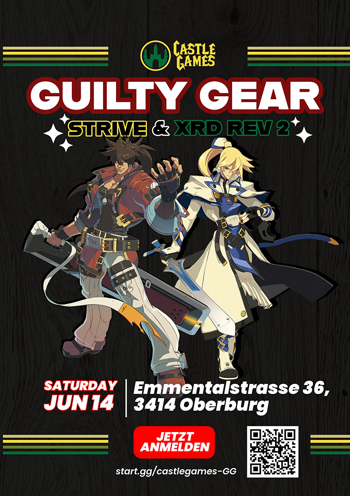 Am 14.06. können sich Spieler aus der Region Bern und der ganzen Schweiz in „GuiltyGear -Strive-“ und dem „Vorgängertitel GuiltyGear Xrd: Revelator 2“ messen! Die beiden Turniere fangen dabei um 13:00 Uhr an, aber die Venue hat bereits ab 11:00 Uhr für Casual Matches geöffnet.