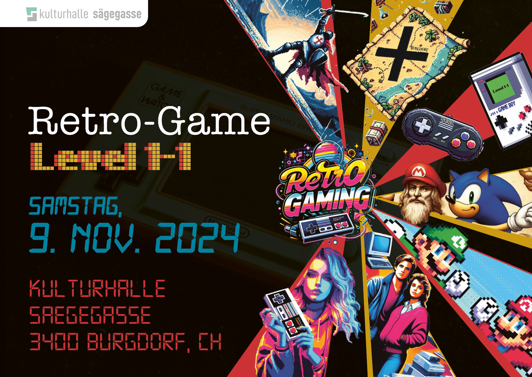 Auch dieses Jahr freuen wir uns riesig, euch beim grossen Retro Gaming Event in Burgdorf willkommen zu heissen! Euch erwartet eine Reise in die Vergangenheit mit einer riesigen Auswahl an Retro Games – von Pong über Super Mario Bros. und Mario Kart bis hin zu Sonic und Crash Bandicoot. Spielt auf allen grossen Konsolen vergangener Zeiten wie Atari, SEGA, Nintendo und Commodore. Ein Spass für die ganze Familie und für alle, die mit diesen Geräten aufgewachsen sind! Du möchtest es eher gemütlich nehmen? Unsere Game Boy Lounge bietet alle Handheld Konsolen zum Zocken und lädt dich ein auf den supergemütlichen Sofas Platz zu nehmen.